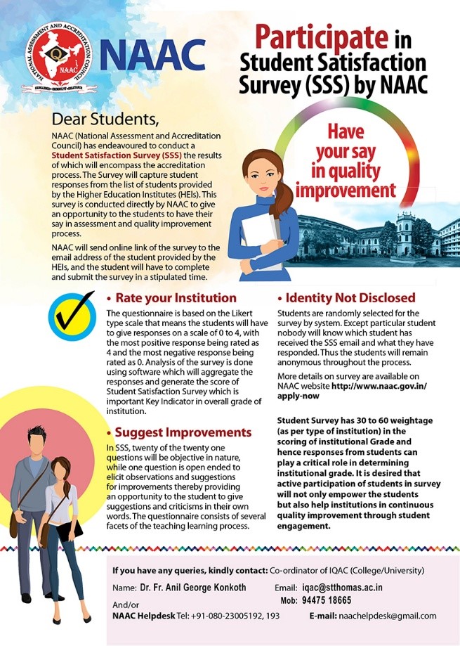 Dear students, NAAC (National assessment and accreditation council) has endeavoured to conduct a student satisfaction survey, The result of which will encompass the accreditation process. The survey will capture student response from the list of students provided by the higher education institute (HEIs). The survey is conducted directly by NAAC to give an opportunity to the student to have their say in assessment and quality improvement process. NAAC will send online link of the survey to the email address of the student provided by the higher education institute and the student will have to complete and submit the survey in a stipulated time.